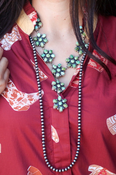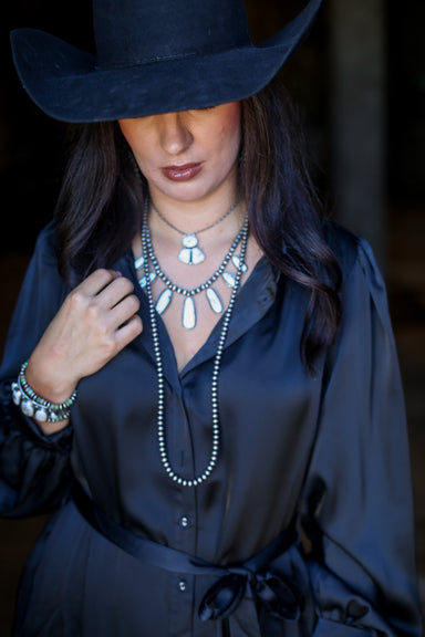 Embrace southwestern elegance with this striking turquoise canyon fringe necklace. Featuring genuine turquoise stones suspended from delicate fring...