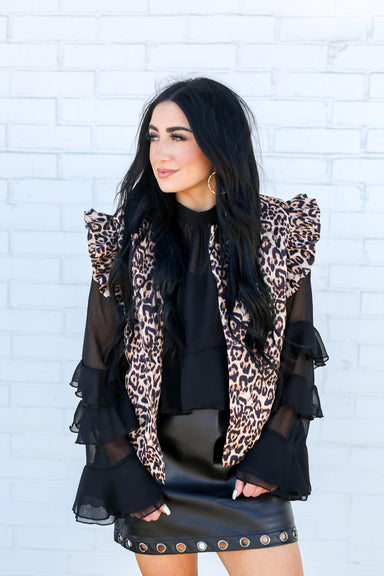 Add a wild touch to your outfit with our Leopard Ruffle Vest. Its playful ruffles and bold print bring fun flair to any look, perfect for layering ...