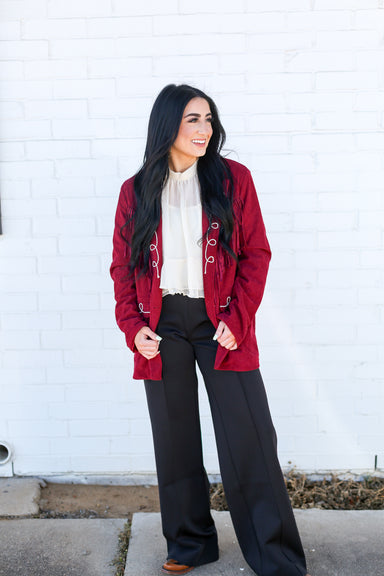 Saddle up in style with this Gone Roping Wine Blazer, where Western flair meets modern edge. Crisp white embroidered rope details trace the collar,...