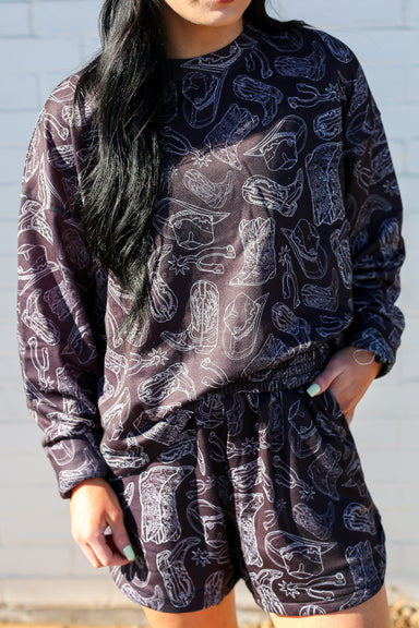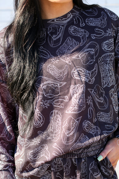 Material: lightweight fabric for a luxurious feel and comfortable fit. Color/Pattern: Black base with an all-over Western-inspired print, featu...