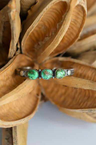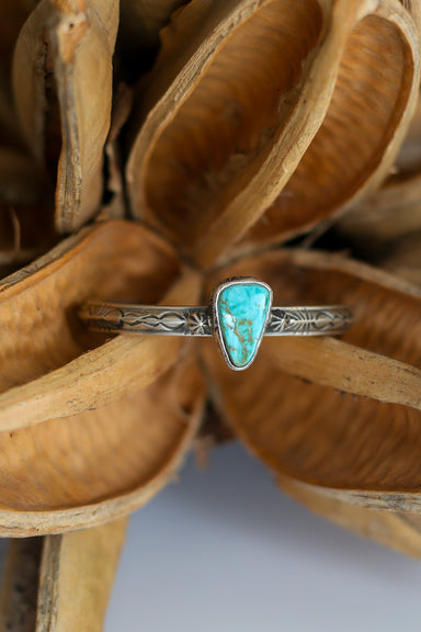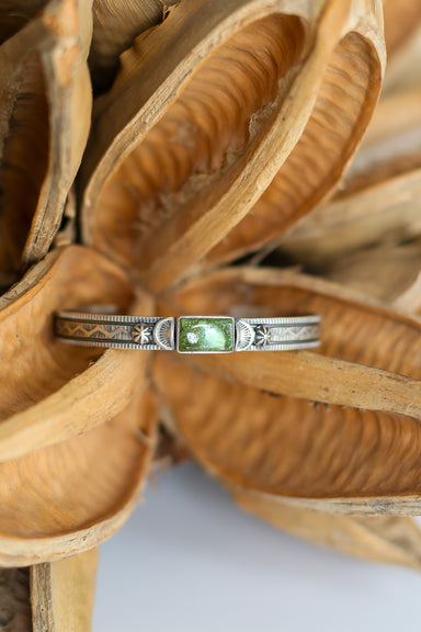These raised triangle cuffs have a unique Turquoise stone in the middle with unique stamping all the way around the cuff. These cuffs do have a thi...