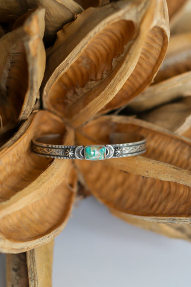 These cuffs have stamping all the way around them. They have a rectangle Turquoise stone in the middle. They are a great stacker cuff for your coll...