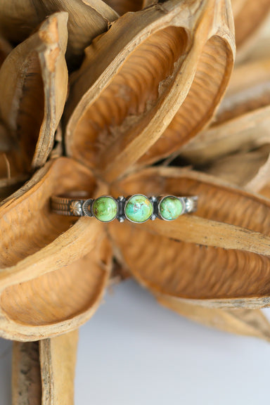 These cuffs have three Sonoran Gold Stones in them. They have unique stamping all the way around it. It measure right 6 1/2 inches around.