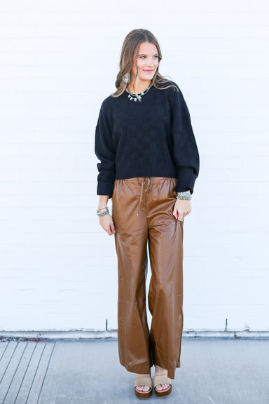 A chic black checkered crop knit sweater that effortlessly combines classic style with contemporary appeal. Perfect for layering or wearing solo, t...