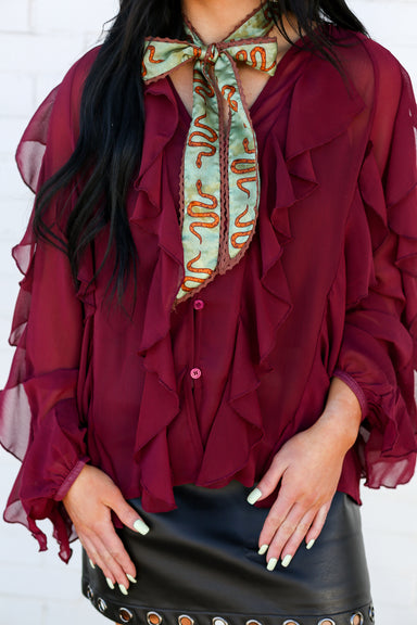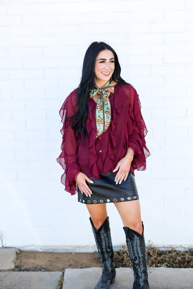Elevate your style with this Burgundy All Over Ruffle Blouse, designed to blend romance and sophistication. Its flattering V-neckline frames your f...