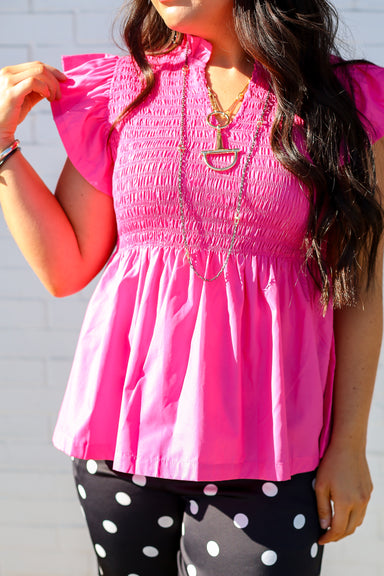 Twirl into spring with this Barbie Pink Willow Flutter Sleeve Blouse—a playful take on feminine style. The smocked bodice provides flattering struc...