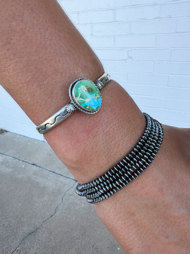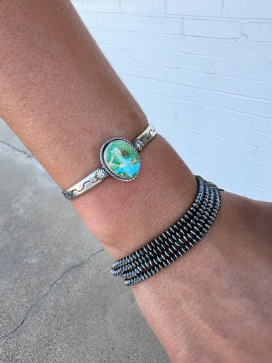 Experience the beauty and radiance of our Stamped Sonoran Gold Cuff, handcrafted with a stunning 1/2 inch stone and embossed with genuine Sonoran g...