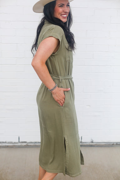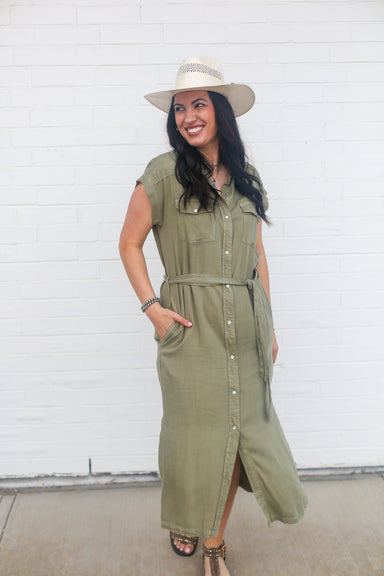 Elevate your wardrobe with our versatile Sage Midi Dress. Featuring a stylish tie belt and front button detailing, this adaptable piece transforms ...