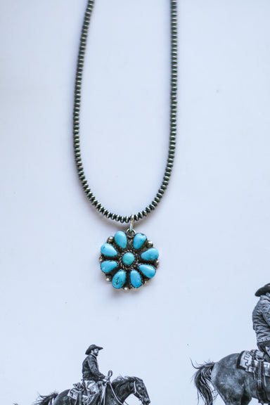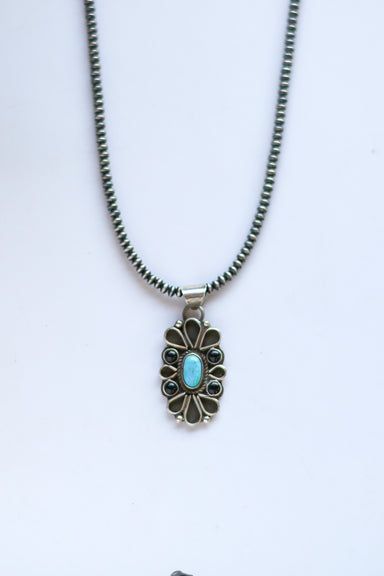 Stamped by Native American Artist Chimney Butte, Stamped Sterling and measures 2 3/4 inches with a bail opening at 12mm, sand cast creation with ge...