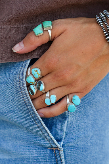 Featuring a pair of vibrant turquoise stones, this adjustable ring ensures a perfect, personalized fit every time. Its flexible design, adapts comf...
