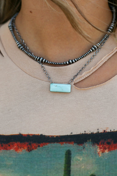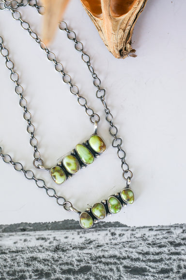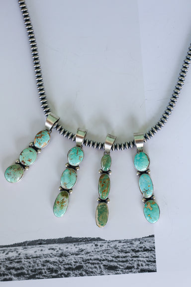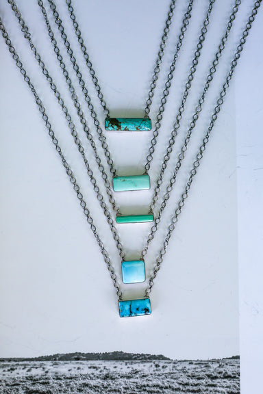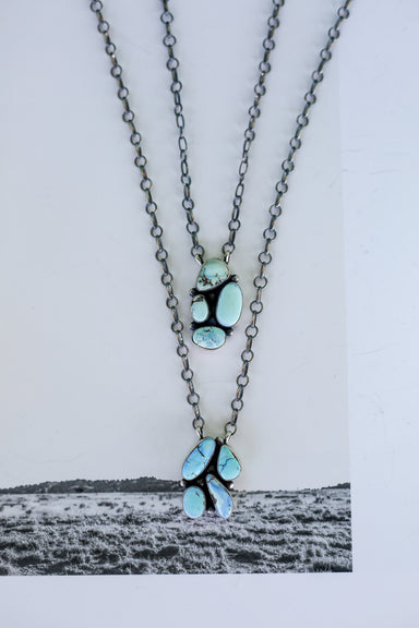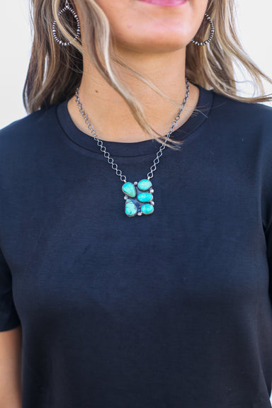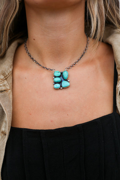 This necklace features a distinctive design with a blend of Turquoise stones. Measuring 18 inches in length, it includes a link chain that allows y...