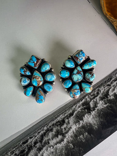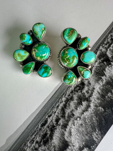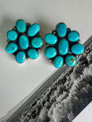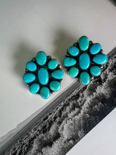 Classic concho style with the perfect turquoise addition, handmade by Navajo artist Robert Jackson, Stamped Sterling with a post that sits 1/2 inc...