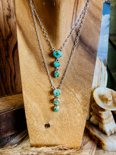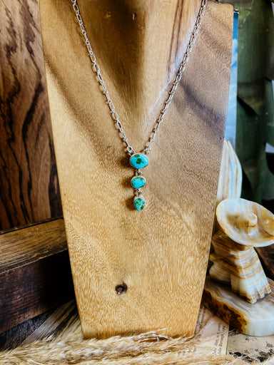 $599.00| /The 4 Stone Palomino Lariat Necklace features stunning turquoise stones and a 3" drop, creating a perfect 18" necklace that will elevate any outfit.