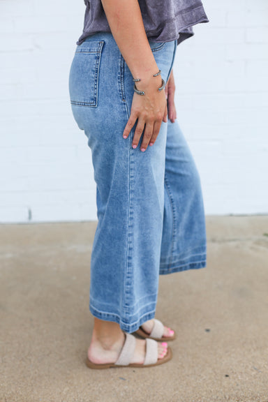 Wide leg Cropped jean High waisted Unique front pockets Materials 98% cotton 2% spandex Measurements on a size 28 Inseam- 25 inches ...
