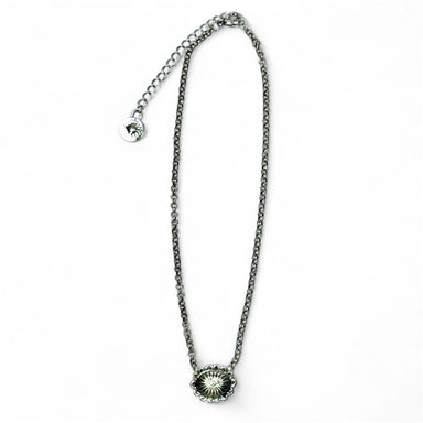 Elevate your style with this 15" dainty concho necklace, beautifully plated in 18k white gold. Its delicate design adds a subtle yet striking touch...