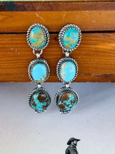 Sterling Sliver Kingman Turquoise Has a top post Measures 1 inch in length Made by the Trish Largo Rope Edges
