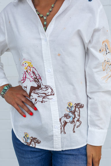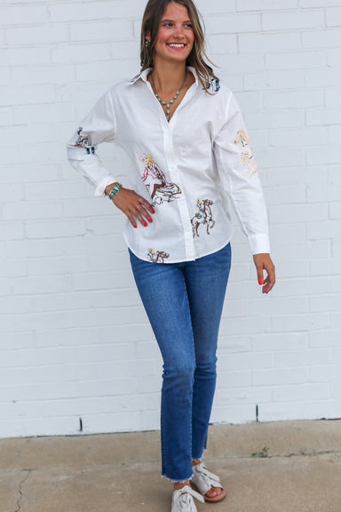 This shirt features vibrant cowgirl embroidery spread across the entire fabric, adding a lively and stylish touch to your wardrobe. Model is wearin...