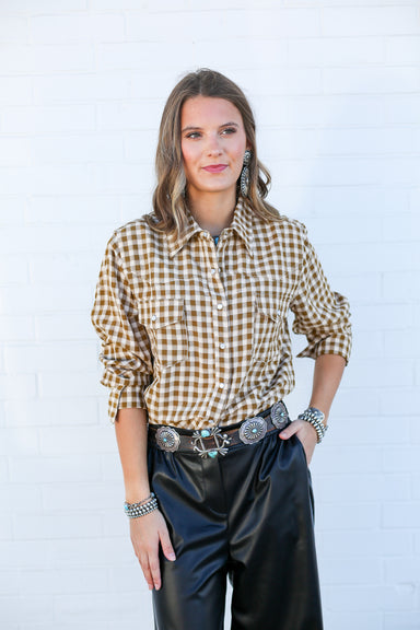 Add a touch of playful charm to your wardrobe with the Brown Gingham Pearl Snap. This classic gingham pattern combines timeless style with convenie...