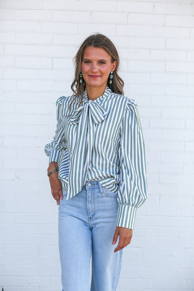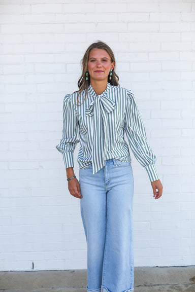 Pinstripe top Bow strings are attached on the collar Buttons all the way down Light weight material Material 97% polyester 3% spandex Me...
