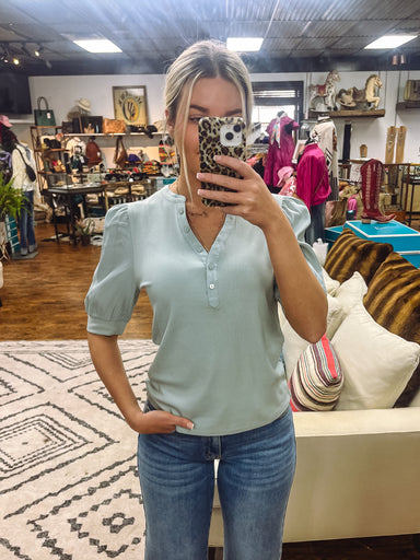 Experience the elegance and sophistication of our Mint Tanner Puff Sleeve Blouse! This stylish and versatile piece adds the perfect touch of femini...