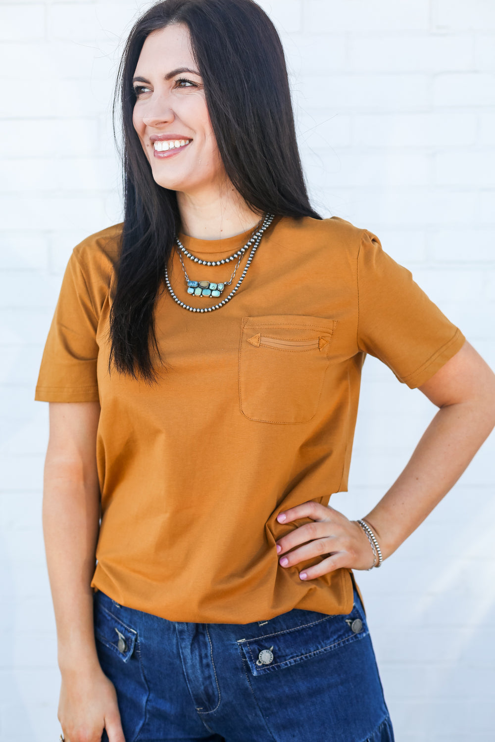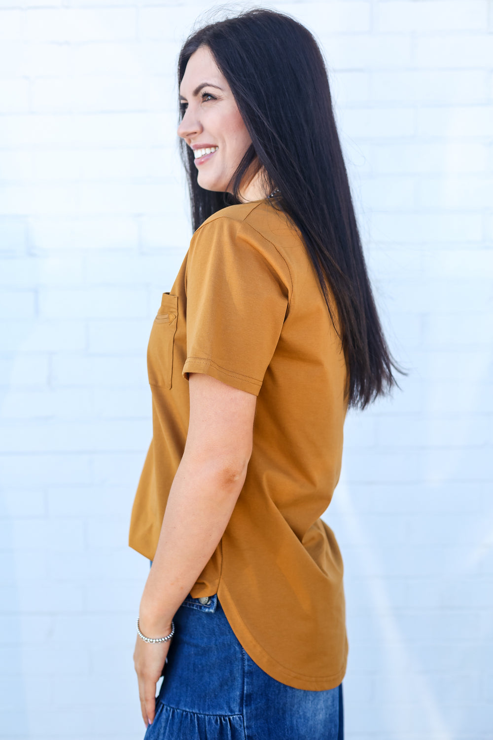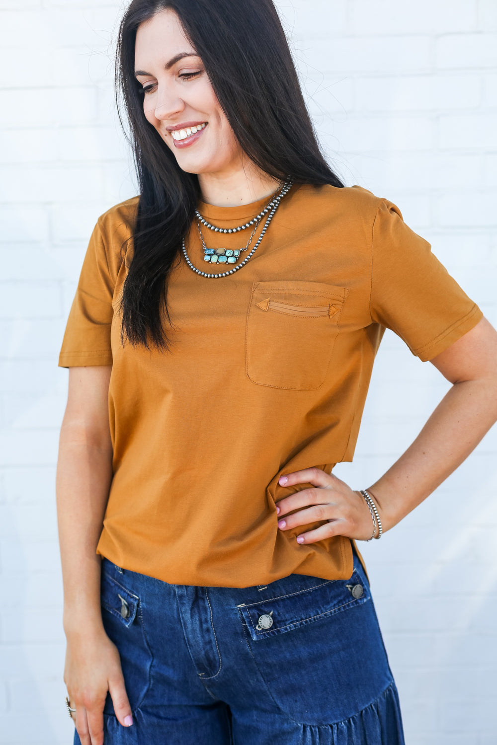 Experience ultimate style and functionality with the Boon Buckskin Top featuring an adorable pocket detail!