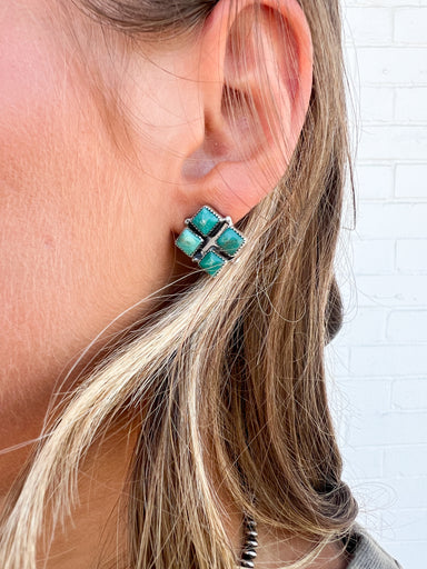 Dainty everyday cluster studs, kingman turquoise, has a center post.