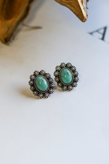 Handmade and stamped by the Navajo artist P Spencer. They have a top post, measure right at an inch in length and have authentic kingman turquoise.