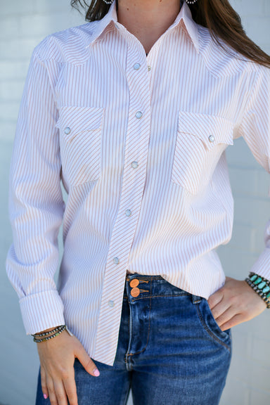 Peach Pinstripe PawPaw Pearl Snap shirt features a classic pearl snap closure and soft pinstripe pattern in warm peach tones. Perfect for layering ...