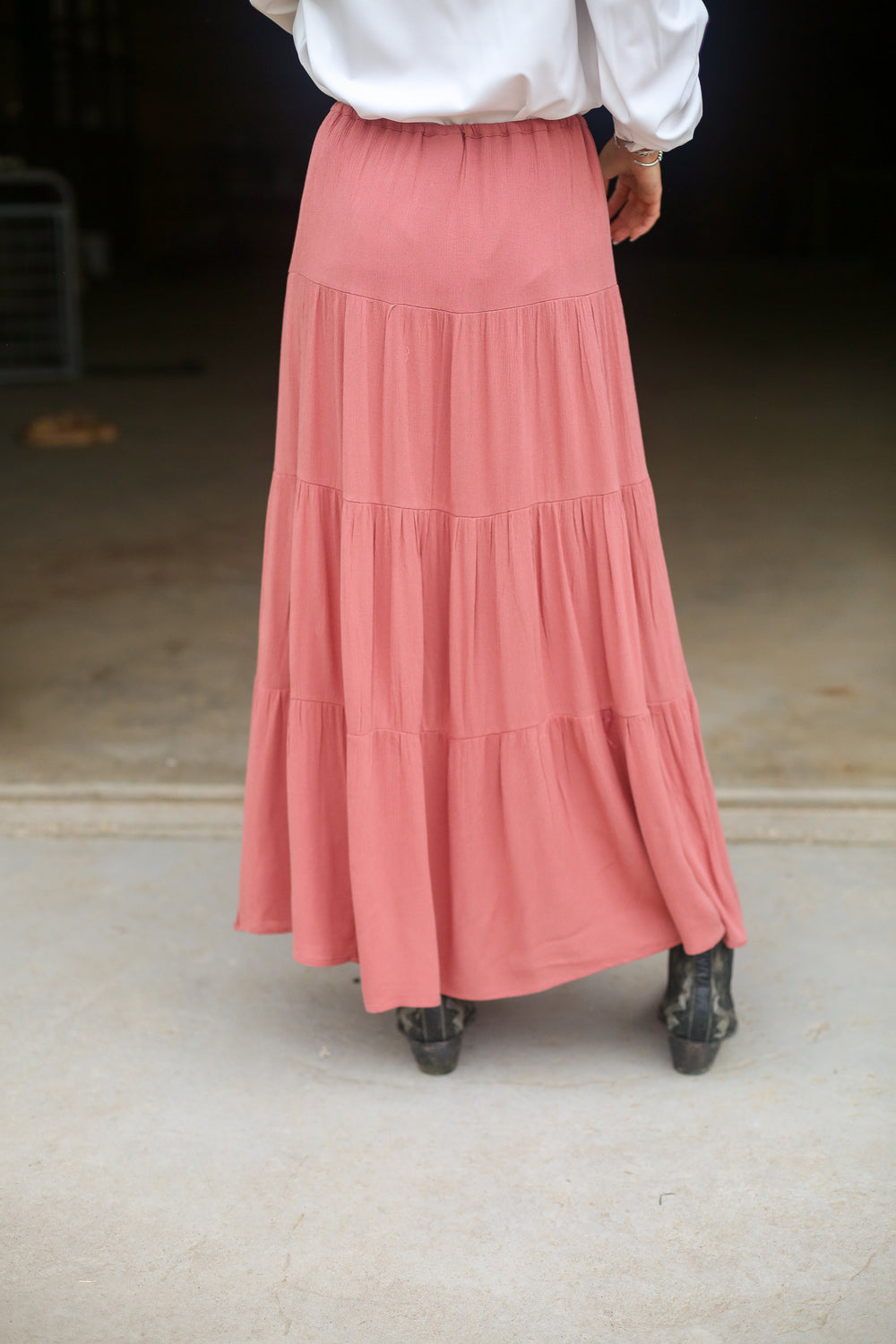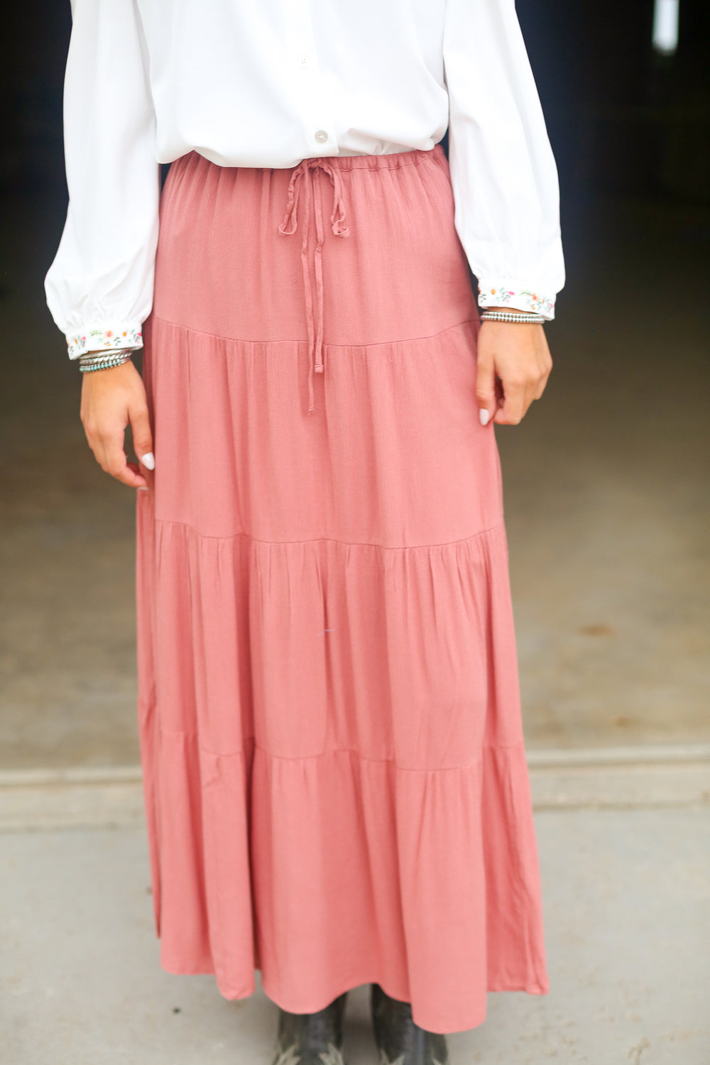 Get ready to fall in love with this mauve-toned maxi skirt, the perfect addition to your wardrobe! Crafted from a luxurious blend of Rayon and Polyester, this skirt features a stretchy waistband and a charming tie detail in the front. Embrace effortless style and comfort with this must-have piece.