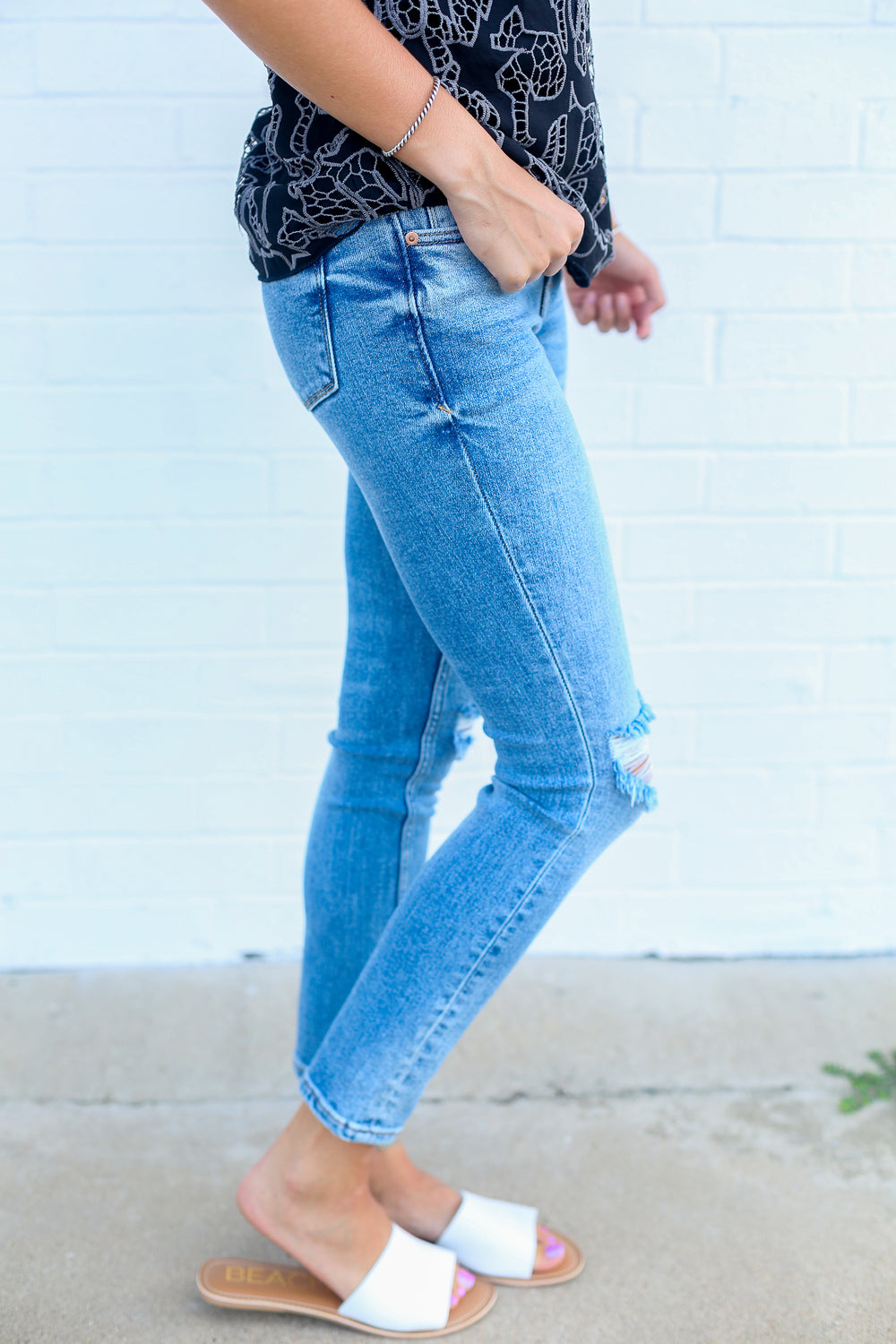 These mid-rise girlfriend jeans feature a slim leg silhouette that hugs your natural waist for a flattering, streamlined fit. Crafted from comfortable stretch denim, they offer an ankle-length cut enhanced with stylish knee distressing, hand-sanded whiskers at the hips and back knees, along with unique inseam chevron and pocket detailing. Perfect for a chic, effortlessly slim look that feels as good as it looks.