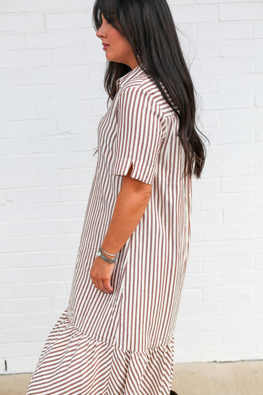 Elevate your wardrobe with the Brown Pinstripe Button Up Dress, a refined piece that combines timeless elegance with modern tailoring. The subtle p...