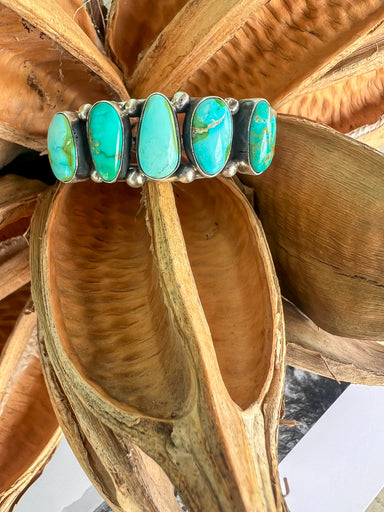 Genuine Turquoise Stamped sterling silver 5.5mm wide band 1 in turquoise stones Adjustable to wrist