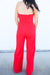 Elevate your wardrobe with this elegant red strapless pleated jumpsuit, designed to flatter with its flowing pleats and contemporary silhouette. Perfect for formal events or a chic evening out, it combines sophistication and comfort seamlessly, making a bold yet refined statement.
