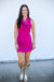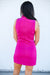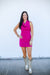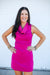 Effortless elegance meets bold color in this magenta draped sleeveless mini dress. The fluid draping creates a flattering silhouette while the vibrant hue commands attention. Perfect for cocktail events, date nights, or whenever you want to make a refined statement.