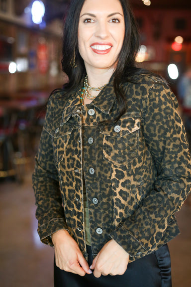 Elevate your style with this sophisticated leopard print denim jacket, meticulously designed from durable denim for lasting wear. Featuring elegant...