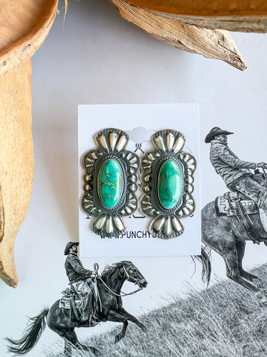 Classic concho style with the perfect turquoise addition, handmade by Navajo artist Robert Jackson, Stamped Sterling with a post that sits 1/2 inc...