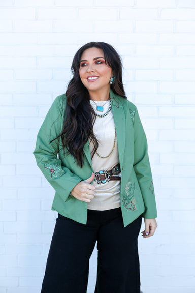 This vibrant green blazer is a total showstopper with its gorgeous floral embroidery and spirited bucking horse motif. It's the perfect way to inje...