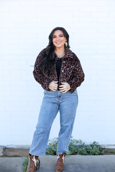 Elevate your wardrobe with this sophisticated cropped faux fur jacket in a striking leopard print. Featuring a structured collar and practical fron...
