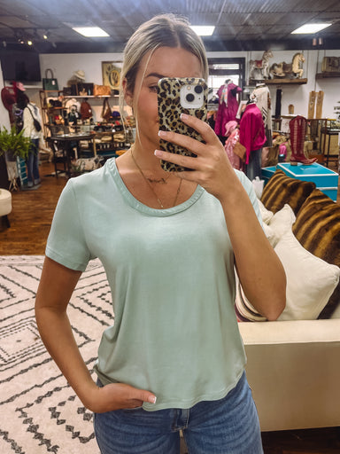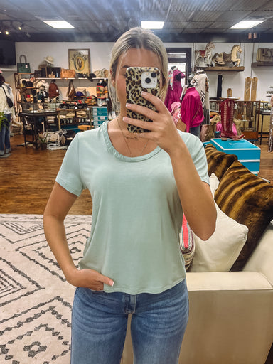 The Mint Miranda Tee features a stunning leather neckline detail for a touch of elegance paired with its classic, yet fashionable, mint design.