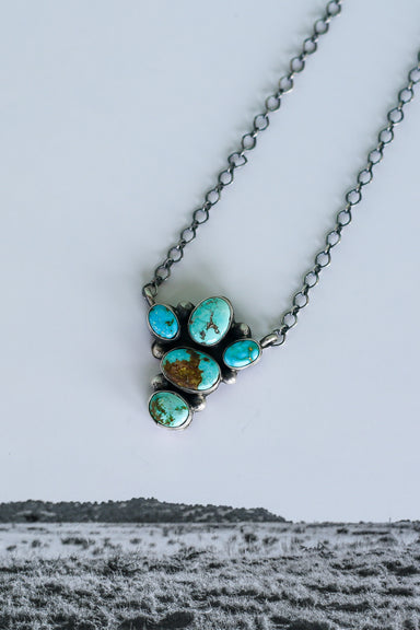 This necklace features a distinctive design with a blend of Turquoise stones. Measuring 18 inches in length, it includes a link chain that allows y...