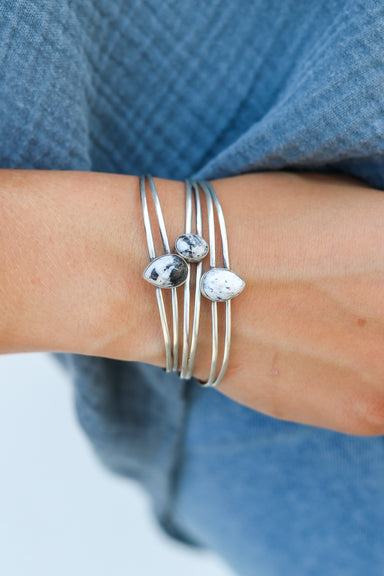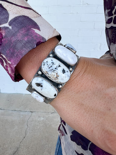 Stamped by the artist "A", has some adjustability, measure at 6 1/2 inches around, includes 5 White Buffalo stones and silver detailing.