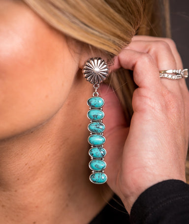 Make a bold statement with our 2.75" 7 Stone Turquoise Earrings set on a stunning silver burst post. Featuring seven vibrant turquoise stones arran...
