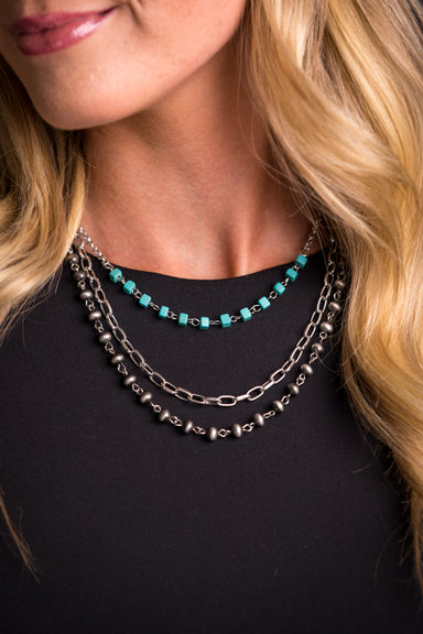 Make a statement with this 16" silver disc beaded necklace featuring green turquoise and faux Navajo pearl accents. The mix of earthy tones and met...