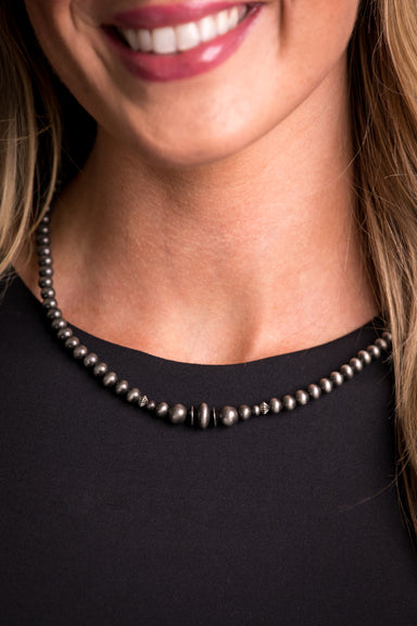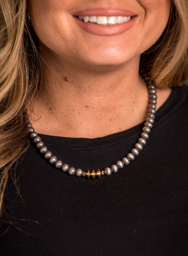 This 14" dainty faux Navajo pearl choker is a timeless blend of simplicity and Western charm. Featuring small, burnished beads for a lightweight an...