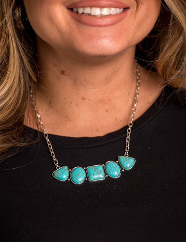 Add a pop of color with this 18" turquoise bar necklace featuring six polished stones. Set in a sleek horizontal design, this necklace blends minim...