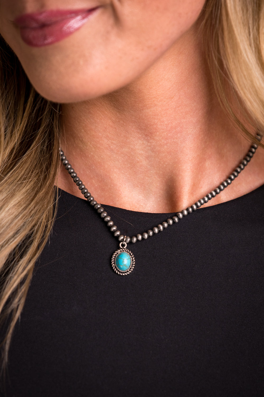 This 13" dainty faux Navajo pearl necklace features an oval turquoise pendant for a touch of classic Western charm. Lightweight and perfect for layering, it adds a subtle pop of color and timeless Southwestern style to any outfit.