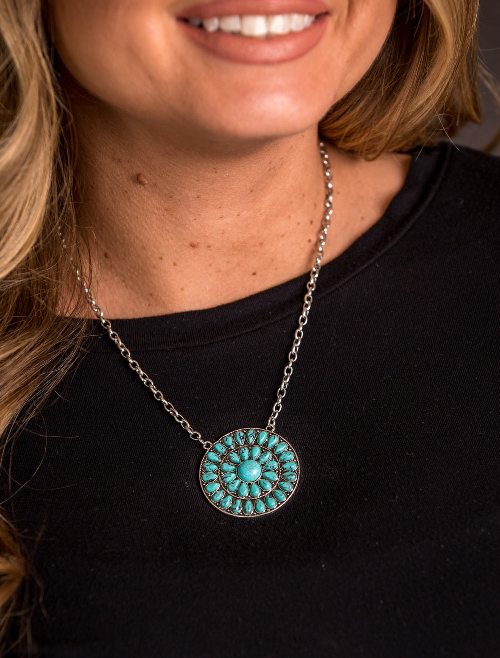 Make a bold Western statement with this 17" round turquoise cluster necklace. Featuring a vibrant circular pendant of polished turquoise stones, this eye-catching piece adds classic Southwest style to any outfit. Perfect for dressing up denim or adding flair to everyday looks.