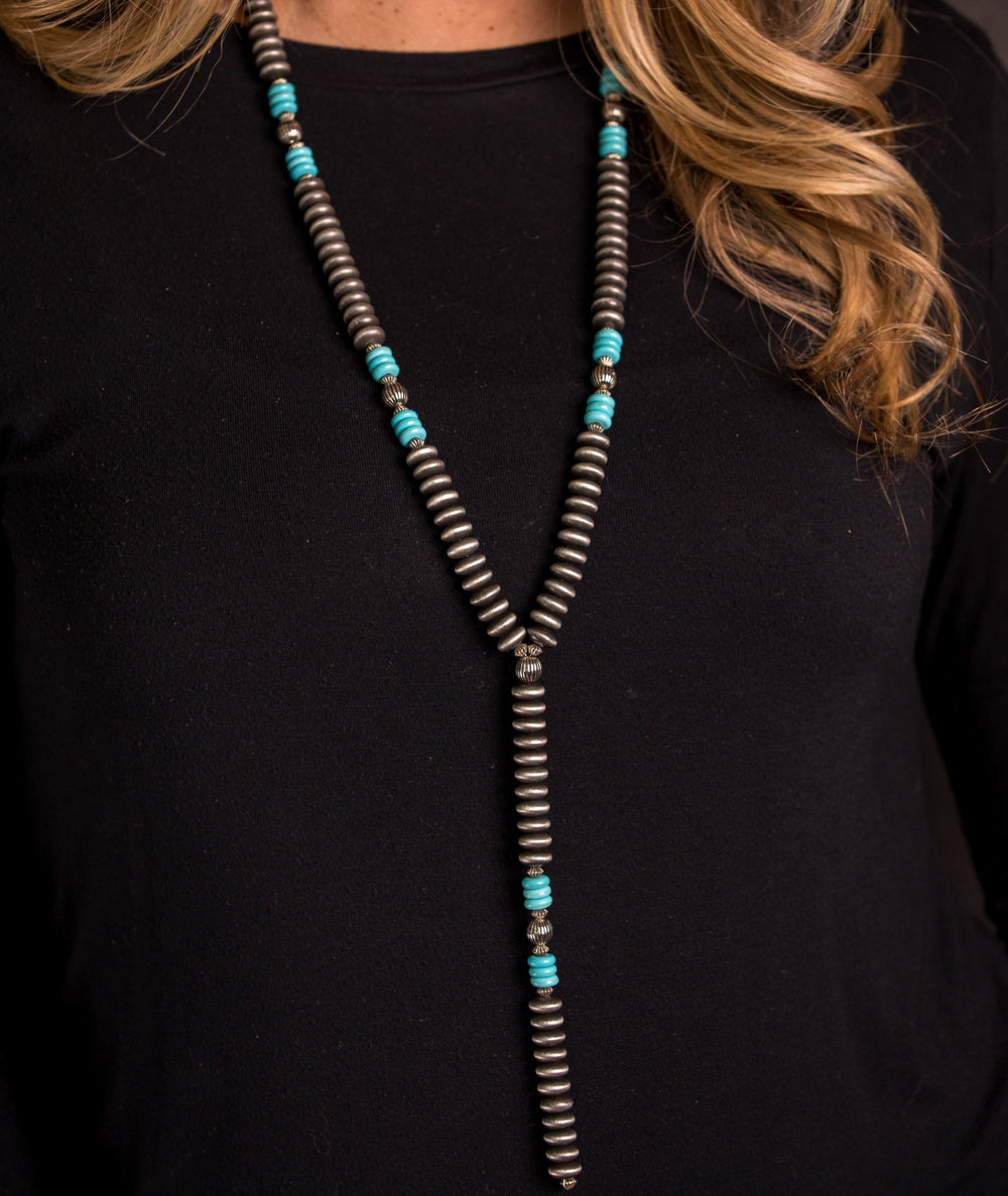 This 27" Faux Navajo Pearl Y Necklace with a 6" drop tail is the perfect blend of rustic charm and modern elegance. Featuring disc beads and turquoise accents, this Western-inspired piece adds a bold yet refined touch to any look. Ideal for layering or wearing as a statement necklace