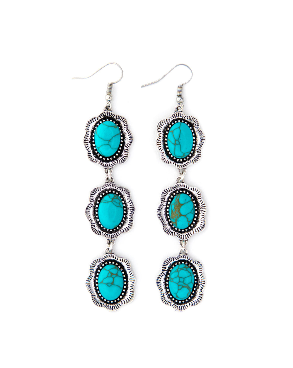 Turn heads with our 3 Tier Turquoise Earrings on classic fishhook backs. Designed with cascading genuine turquoise stones, these lightweight earrings bring bold Southwestern beauty to any outfit. The tiered design adds movement and elegance, making them perfect for both everyday wear and special occasions. Effortlessly stylish and easy to wear with fishhook closures.
