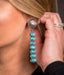 Make a bold statement with our 2.75" 7 Stone Turquoise Earrings set on a stunning silver burst post. Featuring seven vibrant turquoise stones arranged for maximum impact, these earrings blend classic Western charm with standout style. The silver burst post adds texture and shine, perfect for elevating any outfit from casual denim to dressy nights out.